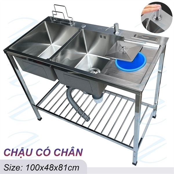 Chậu chén có chân Kazta CH10048H 2 hộc 1 cánh dao thớt rác (I)